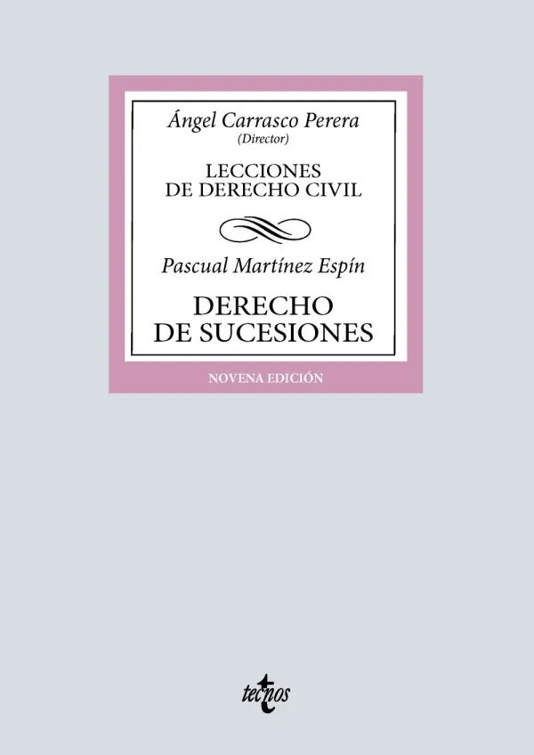 El Derecho de Sucesiones escrito por el Catedrático Martínez Espín pretende ser un texto de referencia tanto para estudiantes de Grado en Derecho y Doble Grado (Derecho y otras titulaciones), como para profesionales -sean jurídicos o no-. Esta obra tiene por objeto ofrecer una visión completa, didáctica y actual sobre los aspectos esenciales del Derecho de Sucesiones. La obra no se limita a ser un manual al uso, sino que pretende contar de una manera sistemática los contenidos básicos de la sucesión mortis causa. Para lograr este objetivo, se han utilizado técnicas diferentes. En primer lugar, se reduce en la medida de lo posible la glosa de normas jurídicas en el cuerpo de texto de enseñanza, gracias a los cuadros que preceden al desarrollo de cada epígrafe. En segundo lugar, se atiende a lo esencial, sin disquisiciones doctrinales o jurisprudenciales. En tercer lugar, cada epígrafe está compuesto por varios párrafos con un título que sintetiza la idea central, con la finalidad de que el lector distinga los contenidos de cada pregunta. En cuarto lugar, las cuestiones más relevantes se contienen en esquemas. Por último, en un cuadro final se sintetizan los conceptos y reglas jurídicas más significativas de cada lección.